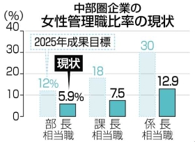 報告書では、中部圏の女性管理職比率は部長相当職で5・9%、課長相当職で7・5%で、係長相当職は12・9%だったと紹介。25年の政府の成果目標は部長相当職から順に12%、18%、30%で、6・1~17・1ポイント下回った。24年時点の全国平均と比べても2・8~8・2ポイント低かった。
