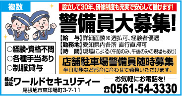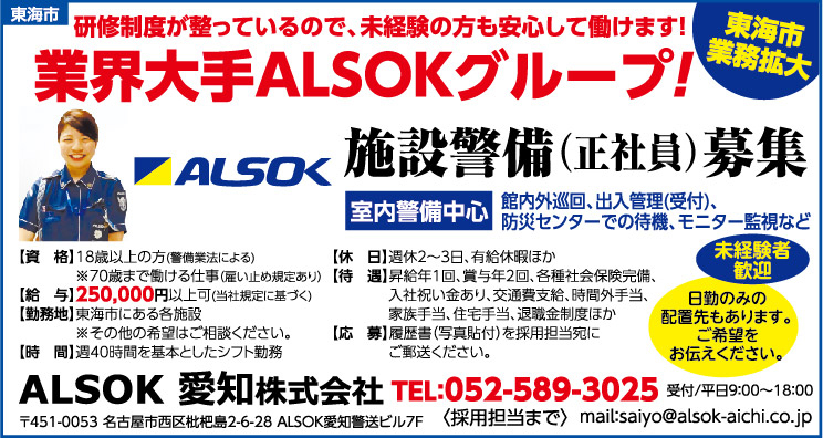 〒451-0053 名古屋市西区枇杷島2-6-28 ALSOK愛知警送ビル7F TEL:052-589-3025 採用担当 メール:saiyo@alsok-aichi.co.jp