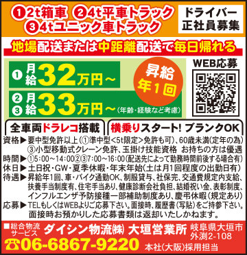 岐阜県大垣市外渕2-108 TEL:06-6867-9220 本社(大阪)採用担当 メール:soumu2@daisinet.co.jp