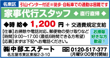 〒460-0002 愛知県名古屋市中区丸の内2-18-20 DK丸の内ビル306号室 TEL:052-218-7778 (求人担当)N38係