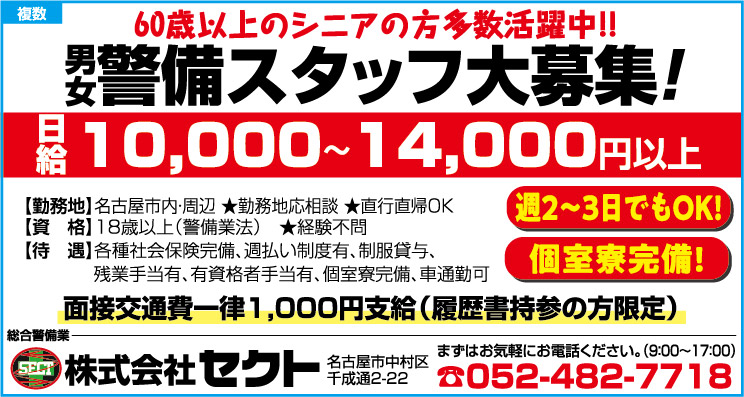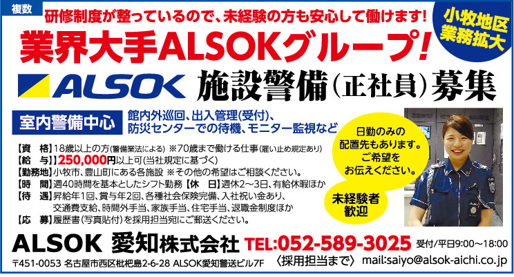 〒451-0053 名古屋市西区枇杷島2-6-28 ALSOK愛知警送ビル7F TEL:052-589-3025 採用担当 メール:saiyo@alsok-aichi.co.jp