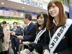 名古屋市中区の金山総合駅では、大村秀章知事や人気アイドルグループSKE48のメンバー二人が参加=写真。「イケメン」で知られるが実は子育てに積極的な「イクメン」でもある東山動物園のゴリラ「シャバーニ」の写真が入ったポケットティッシュ五千個を通勤客らに配布しながら「早めの退社を」「きょうは定時で帰りましょう」などと声を掛けた。