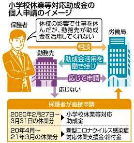 個人申請の流れは、こうだ。まずは、保護者が国の出先機関である各地の労働局の特別相談窓口に相談。労働局は相談を踏まえ、勤務先の企業に助成金の活用を働き掛ける。応じれば、企業が申請。応じない場合は保護者が労働局に直接申請する。助成の決定に必要な休業事実の確認などは労働局が担う。名古屋市の社会保険労務士、木村省吾さん(54)は「制度の利用に強制力はなく、これまでは企業の自主性に任せられていた。労働局が間に入り、企業に働き掛ける仕組みができたのがポイント」と話す。