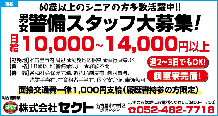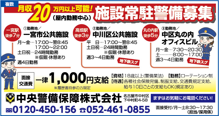 〒451-0053 名古屋市西区枇杷島2-6-28 ALSOK愛知警送ビル7F  TEL:052-589-3025 採用担当 メール:saiyo@alsok-aichi.co.jp