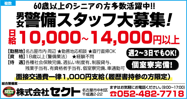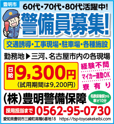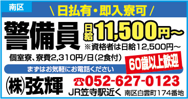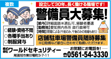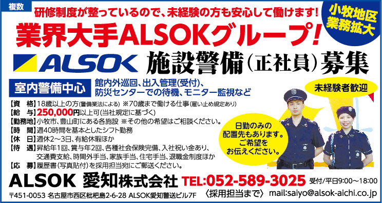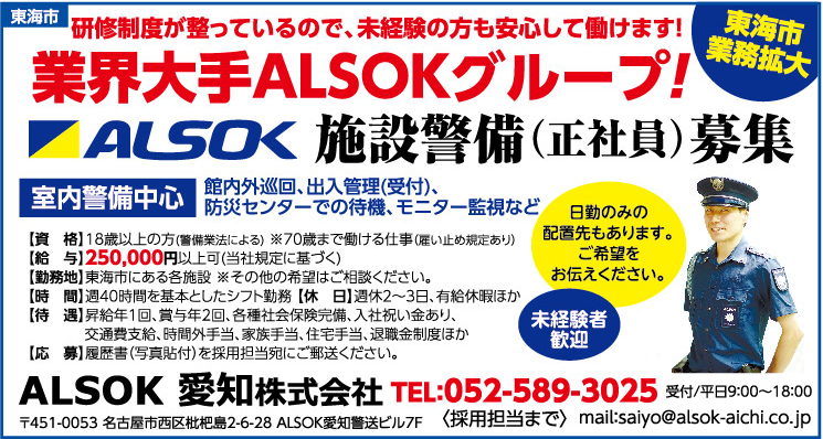 〒451-0053 名古屋市西区枇杷島2-6-28 ALSOK愛知警送ビル7F TEL:052-589-3025 採用担当 メール:saiyo@alsok-aichi.co.jp