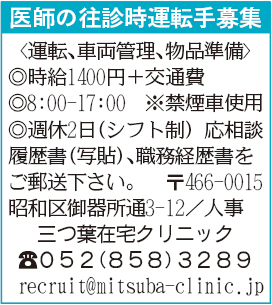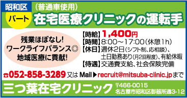 名古屋市昭和区御器所通3-12 御器所ステーションビル3階 TEL:052-858-3289 人事 メール:recruit@mitsuba-clinic.jp