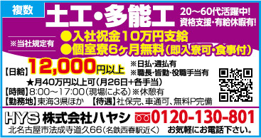 入社祝金10万円(当社規定有)、個室寮6ヶ月無料(即入寮可・食事付)、社保完、車通可、無料P完備、職長・皆勤・役職手当有