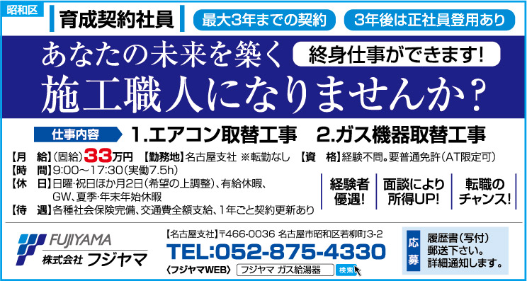 【育成契約社員】1.エアコン取替工事 2.ガス機器取替工事