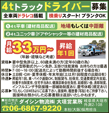 要中型免許以上、60歳未満の方(定年60歳の為)②小型移動式クレーン免許、玉掛け技能の有資格者優遇