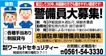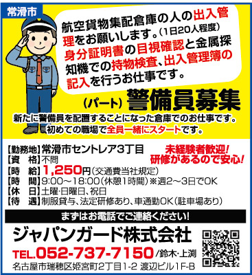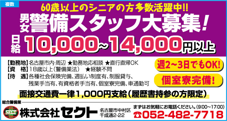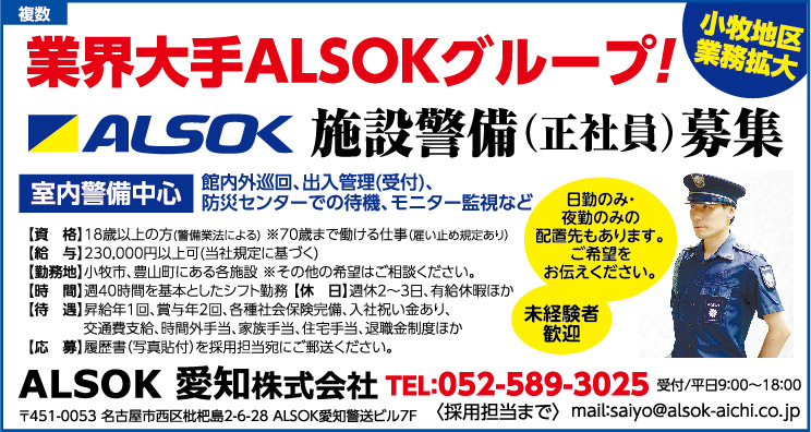 〒451-0053 名古屋市西区枇杷島2-6-28 ALSOK愛知警送ビル7F TEL:052-589-3025 採用担当 メール:saiyo@alsok-aichi.co.jp